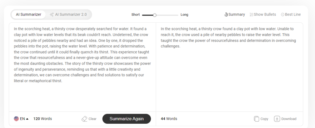 Provide the academic material & select the length: Upload or paste the entire academic material in the input box. We uploaded an essay about “A Thirsty Crow.” After this, adjust the length of the summarized text that you want the tool to generate.