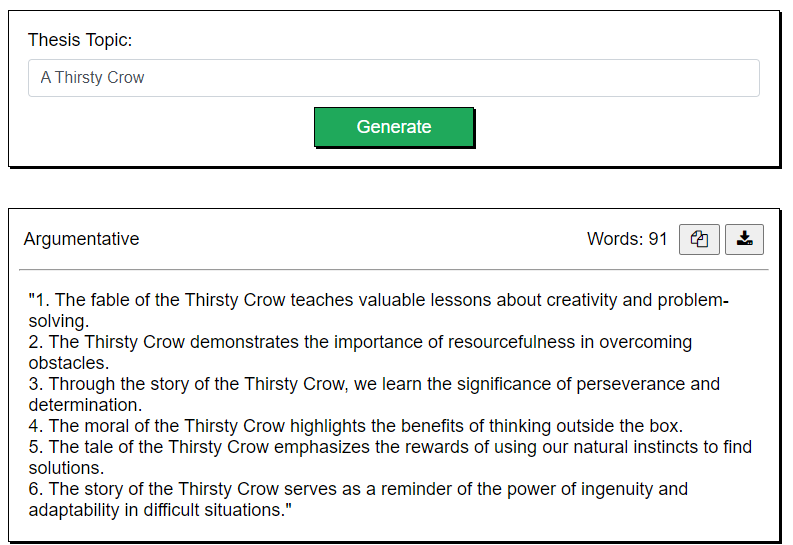 Now, the output result AI summarizer has provided can be used as a “Thesis statement” for the essay “A Thirsty Crow”.