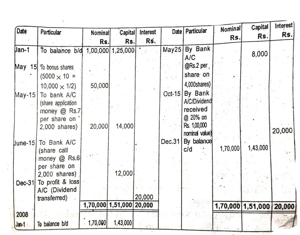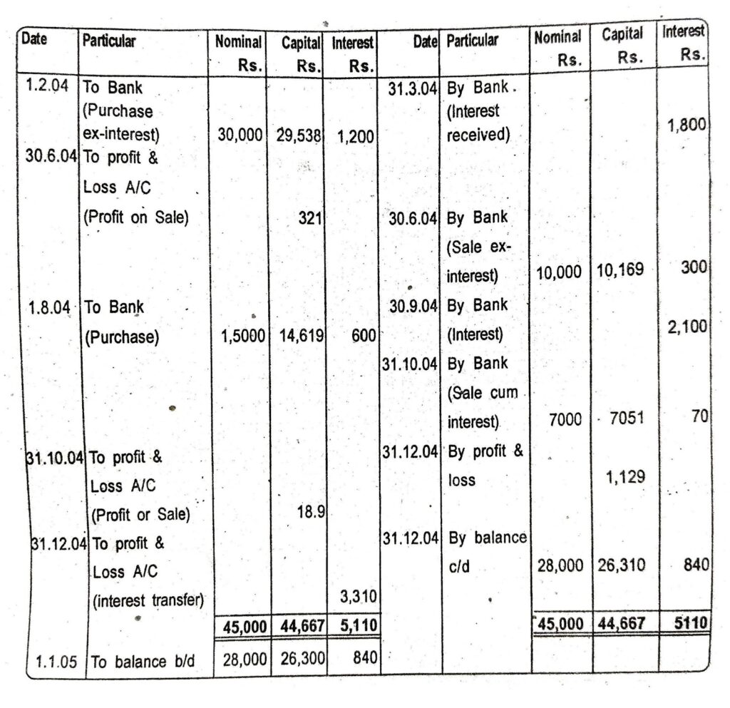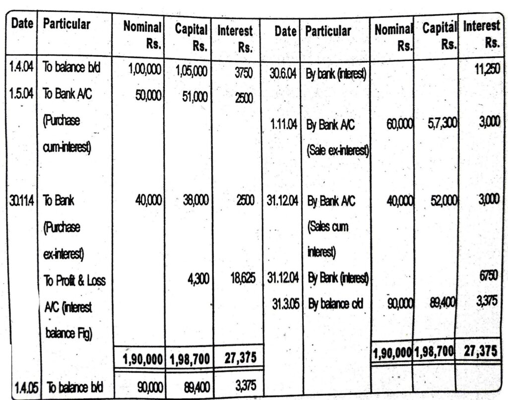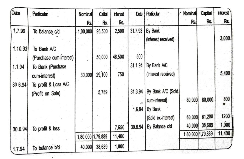 The Investment Account is maintained in a columnar form with three amount columns on each side viz., Nominal, Interest/Income and principal/capital. The face value or nominal value of securities purchased or sold is recorded, however, in the ‘Nominal’ column. The accrued ‘Interest/Income’ column. The third column, ‘Capital/Principal’, reveals the true cost or true sales consideration.