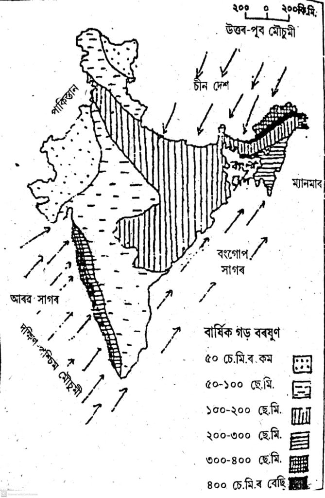 ( ঘ ) ভাৰতৰ মৌচুমী বতাহ আৰু বৰষুণ :- ভাৰতত মৌচুমী বতাহ আৰু বৰষুণৰ যথেষ্ট প্রভাৱ পৰিলক্ষিত হয় । বছৰৰ গ্ৰীষ্ম আৰু শীতকালত মৌচুমী বতাহ প্রবাহিত হয় । গ্রীষ্মকালত দক্ষিণ – পশ্চিম মৌচুমী বতাহ আৰু শীতকালত উত্তৰ – পূৱ মৌচুমী বতাহ প্রবাহিত হয় । দক্ষিণ – পশ্চিম মৌচুমী বতাহ আৰৱ সাগৰৰ ওপৰেদি প্রবাহিত হৈ ভাৰতত সােমায় আৰু এই বতাহৰ প্ৰভাৱতে অসম আৰু হিমালয়ৰ নামনি অঞ্চলত প্ৰচুৰ পৰিমাণে বৃষ্টিপাত হয় । উত্তৰ – পূৱ মৌচুমী বতাহ মধ্য এচিয়াৰ পৰা উত্তৰ – পূৱ দিশেৰে ভাৰতলৈ প্রবাহিত হয় আৰু স্থলভাগৰ পৰা অহা বাবে এই বতাহ অতি শুকান হয় । উত্তৰ – পূৱ মৌচুমী বতাহৰ ফলত বৰষুণ হােৱা দেখা নাযায় ।