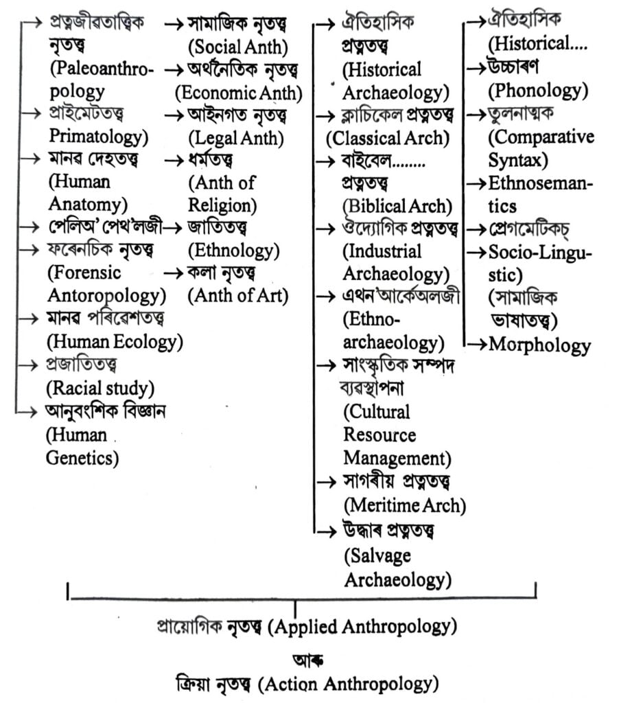 উত্তৰঃ চিত্ৰৰ সহায়ত নৃতত্ত্বৰ বিভিন্ন শাখাসমূহ তলত বৰ্ণনা কৰি সহায়ত দেখুৱা হৈছে―