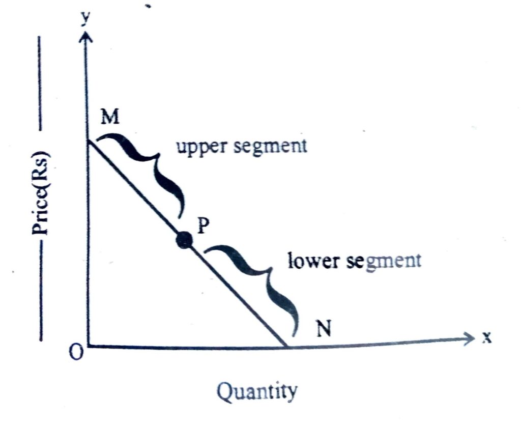 Ans: Point Elasticity method or Graphic method: This method is used when elasticity of different points on a given demand curve is to be measured. This method is explained with the help of a figure. In the figure, MN is a straight line demand curve. In order to measure elasticity of demand at any point on this demand curve, the lower portion from that point is divided by the upper portion from the same point.