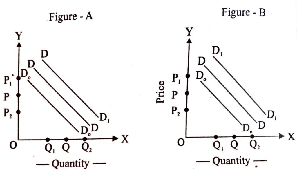 27. Explain the concepts of change in quantity demanded and change in demand using suitable diagrams.