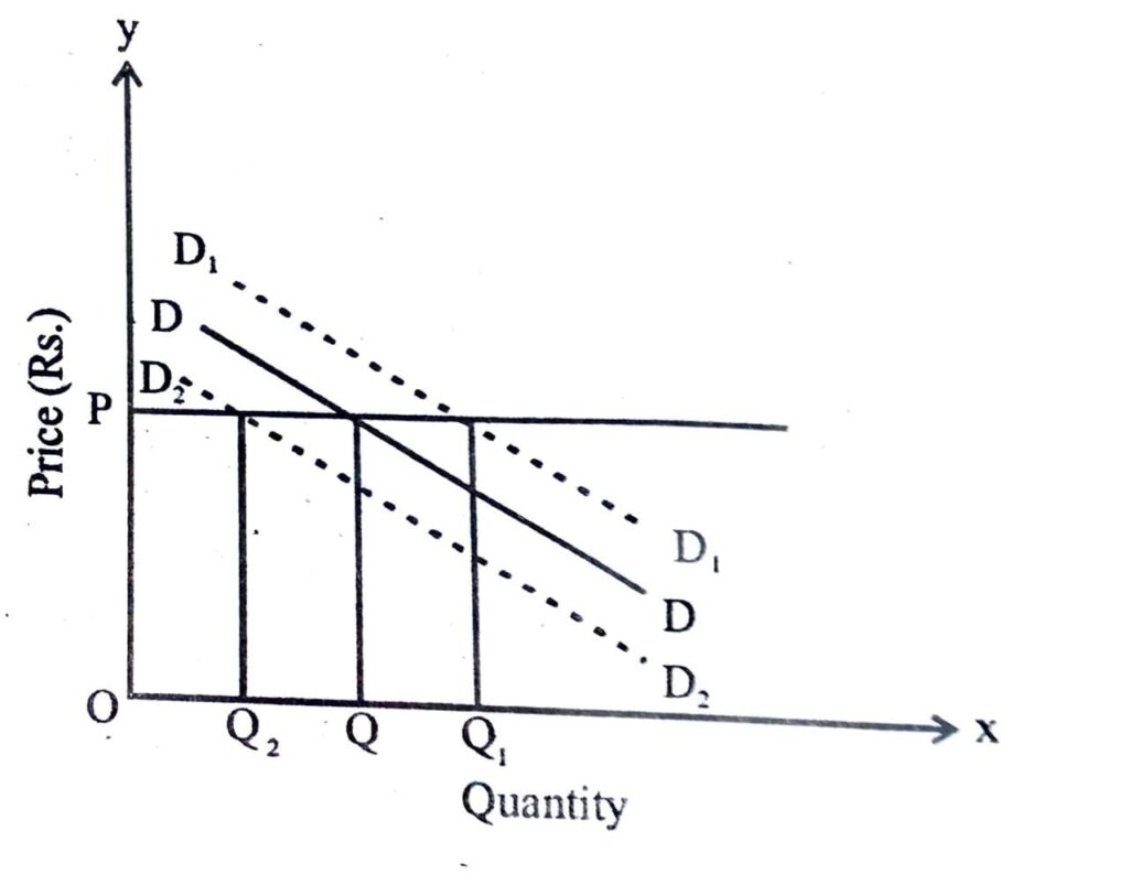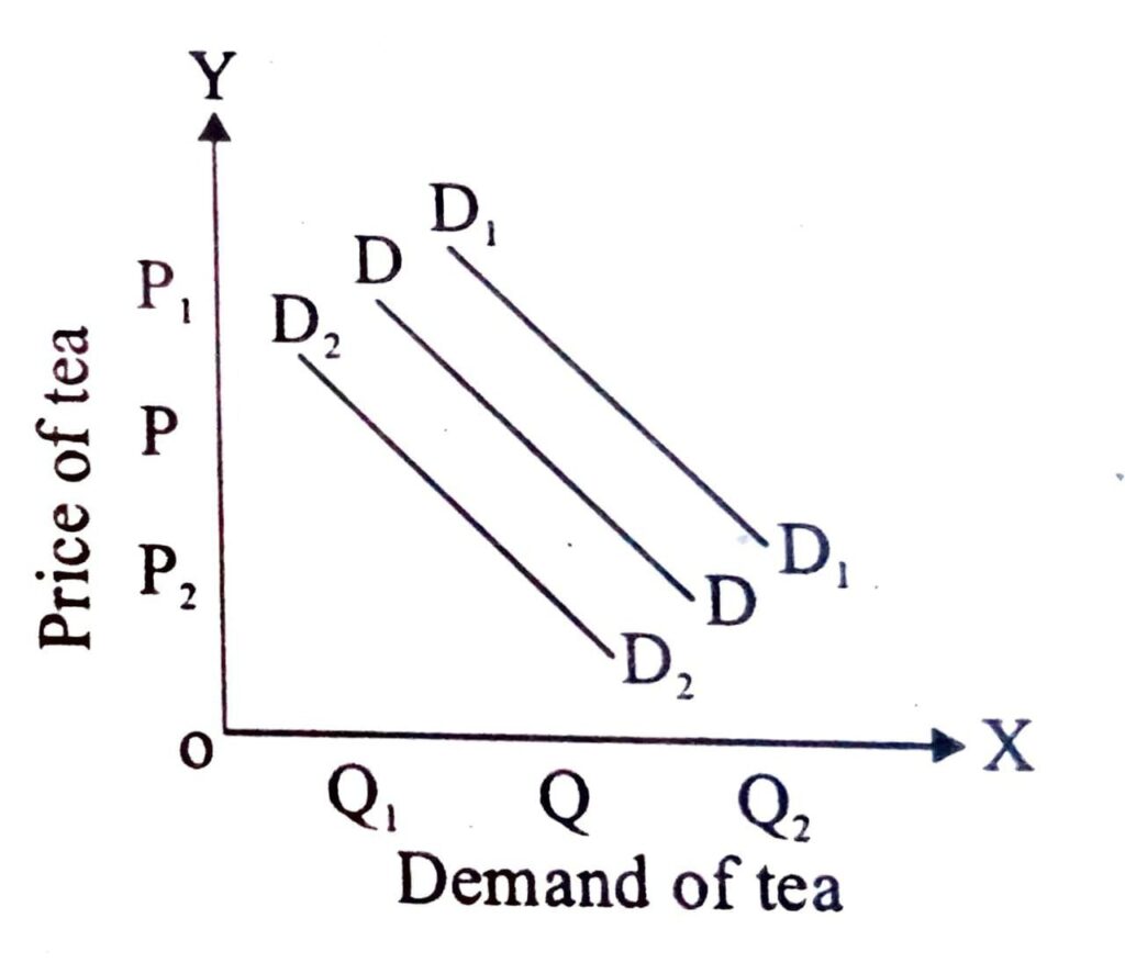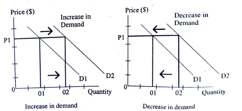 In the fig, DD is the initial demand curve, D₁D₁ is a new demand curve which is to the right of DD and shows increases in demand. That is, more of a commodity is demanded at the same price, or same amount is demanded at the higher prices. D₂D₂ is to the left of DD. This show decrease in demand i.e. less of the commodity is demanded at the same price, or the same amount is demanded at the lower price.