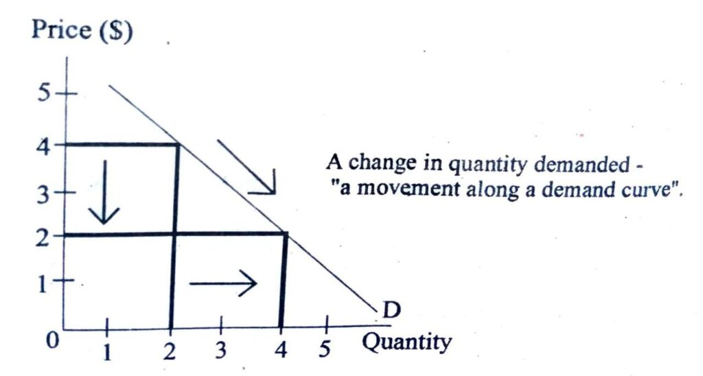 B. Change in quantity demanded: A change in quantity demanded of a good refers to a change of quantity demanded as a result of price change of the good. Graphically, the demand curve remains the same. The change is only shown by a “movement along the demand curve”.