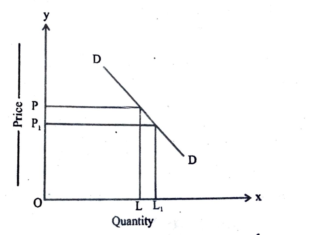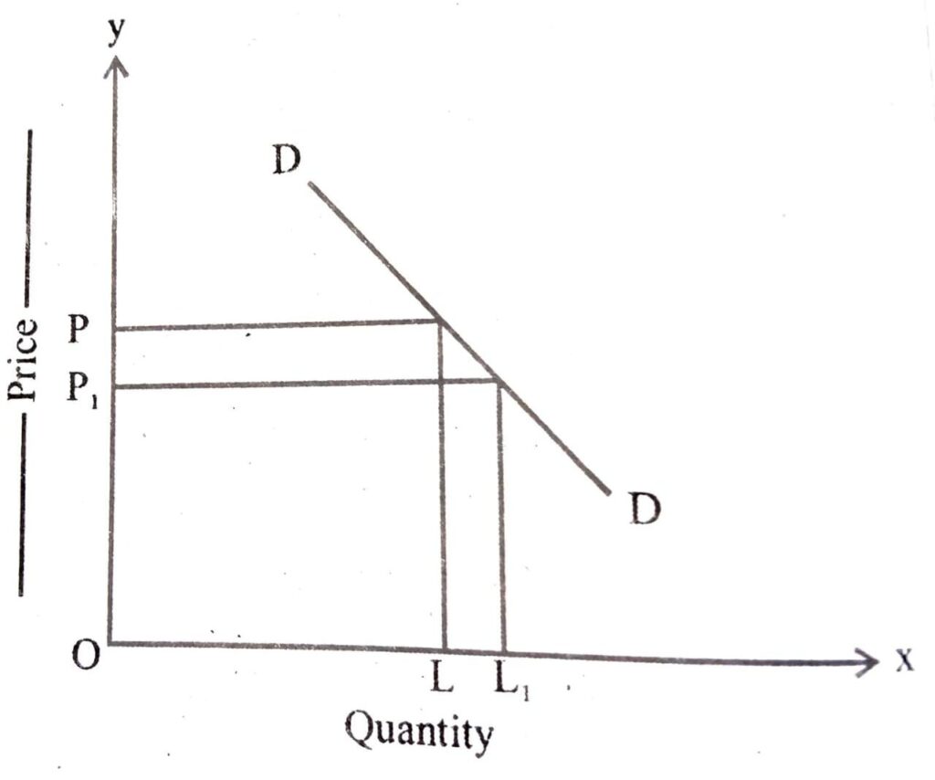 The schedule shows extension of demand in response to decrease in price of the commodity. Thus, demand d stretches from 100 to 150 units when price reduces from Rs. 10 to Rs. 9 per unit. It may be further illustrated with the help of demand curve. In the figure below DD is the demand curve which shows es the demand for commodity. On the ox raxis quantity is measured and oy axis, price of the commodity is measured. When the price of commodity x is OP, the demand is OL but when the price of x fall from OP to OP₁, the demand extend from OL to OL₁. The downward slope of demand curve is an expression of the law of demand.