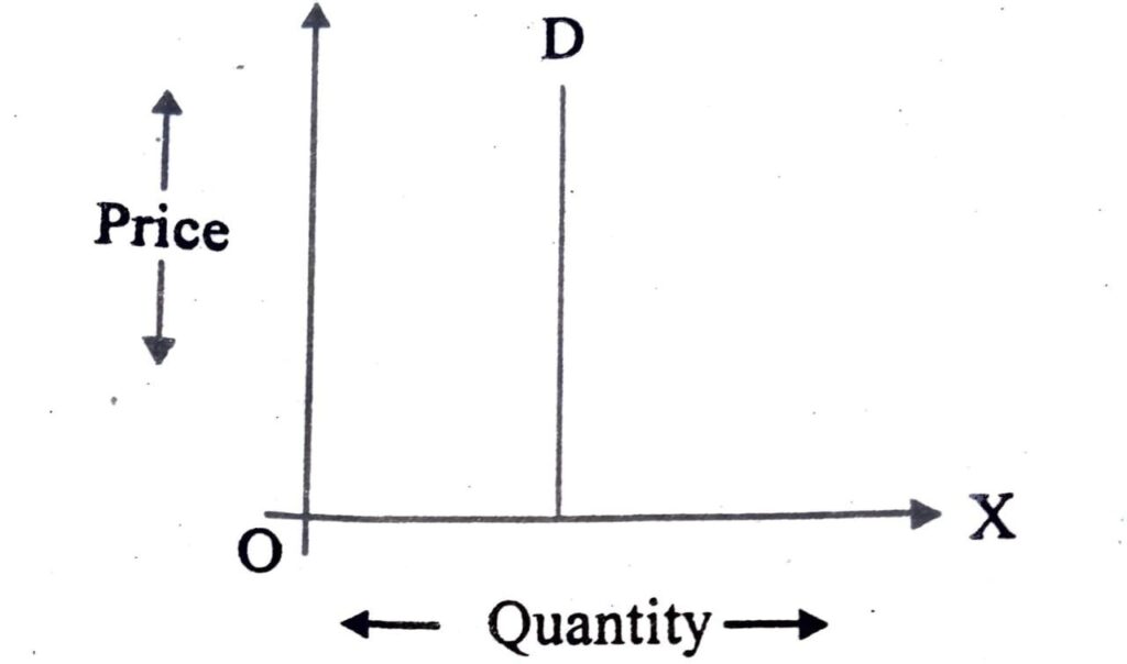 (b) Perfectly inelastic demand : A perfectly inelastic demand is one in which, a change in price causes no change in the quantity demanded. It is a situation where even substantial changes in price leave the demand unaffected. Figure represents perfectly inelastic demand.
