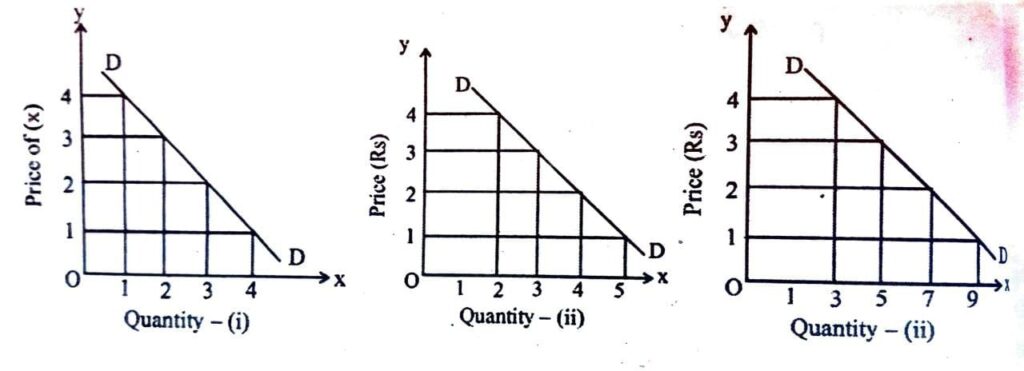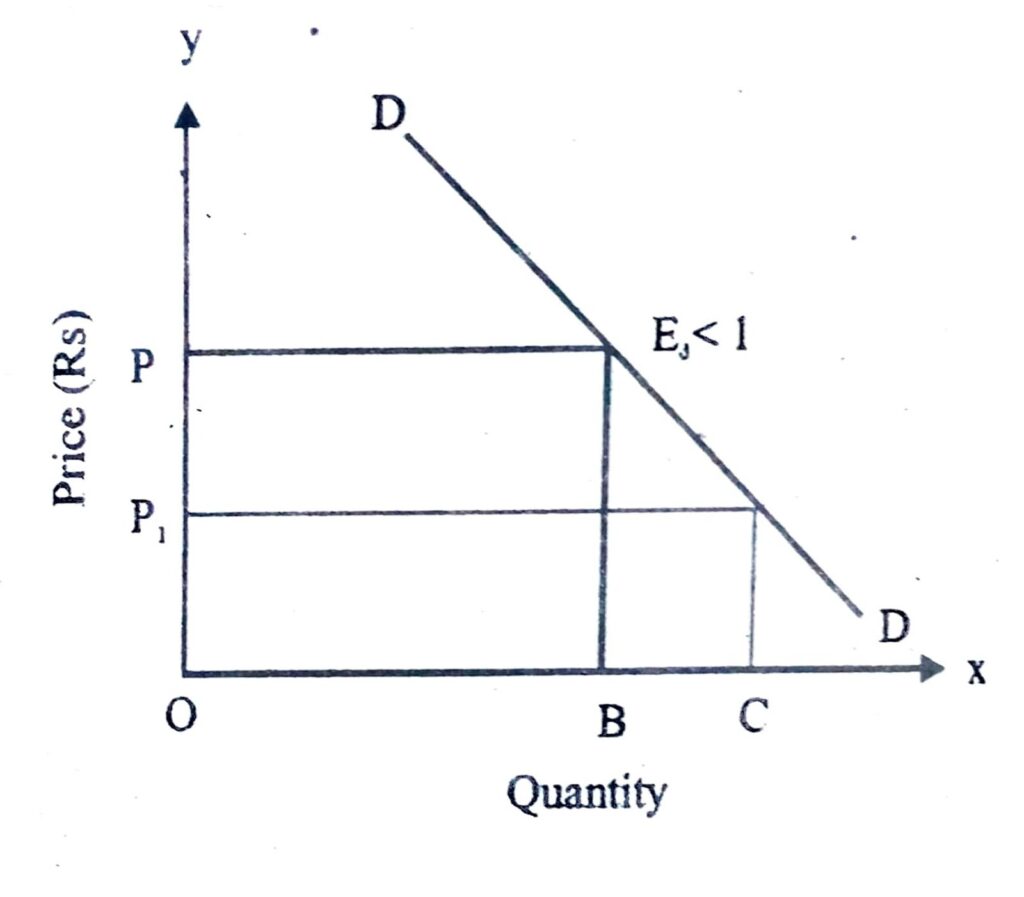(e) Less than unitary elastic : Demand is less than unitary elastic when change in quantity demanded in response to change in price of the commodity is such that, total expenditure on the commodity decrease when price falls and total expenditure increases when price rises. In figure-