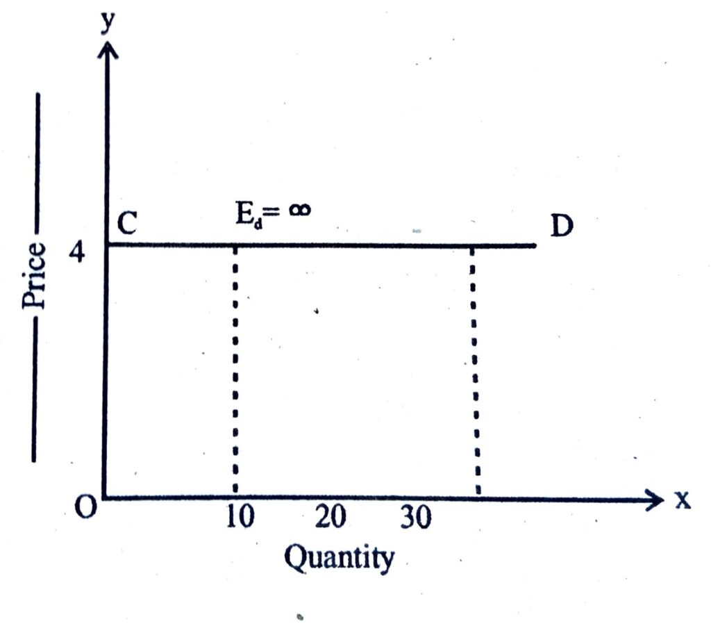 (a) Perfectly elastic demand : A perfectly elastic demand refers to the situation, when demand is infinite at the prevailing price. It is a situation when the slightest rise in price causes the quantity demanded of the commodity to fall to zero. The figure in a diagrammatic representation of perfect elastic demand. CD is perfectly elastic demand curve, which is parallel to ox axis. It shows that if price is slightly increased from Rs. 4, the demand will fall to zero. At the prevailing price of Rs. 4 the consumer may buy 10 or 20 units or any quantity that he desires. In this condition, elasticity of demand (Ed) is infinite (∞).