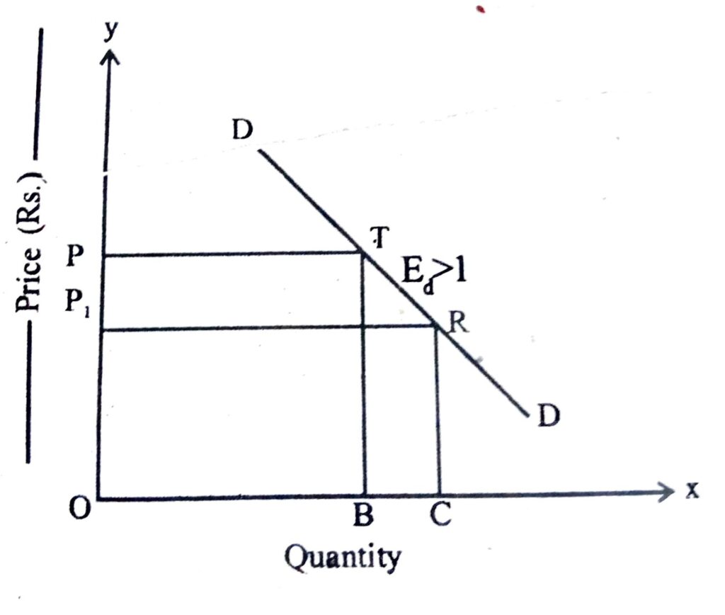 (d) Greater than unitary elastic : Demand is greater than unitary elastic, when change in quantity demanded in response to change in price of the commodity is such that, total expenditure on the commodity increases when price decreases and total expenditure decreases when price is OP, quantity demanded is OB, total expenditure is OB×OP=Area OBTP. Likewise, when price falls to OP₁, quantity demanded is OB, total expenditure is OCXOP₁=Area OCRP₁>A glance at the diagram shows. that area OCRP₁>Area OBTP. It implies that total expenditure increases in response to decrease in price of the commodity. Hence, Ed-greater than unity (>1).