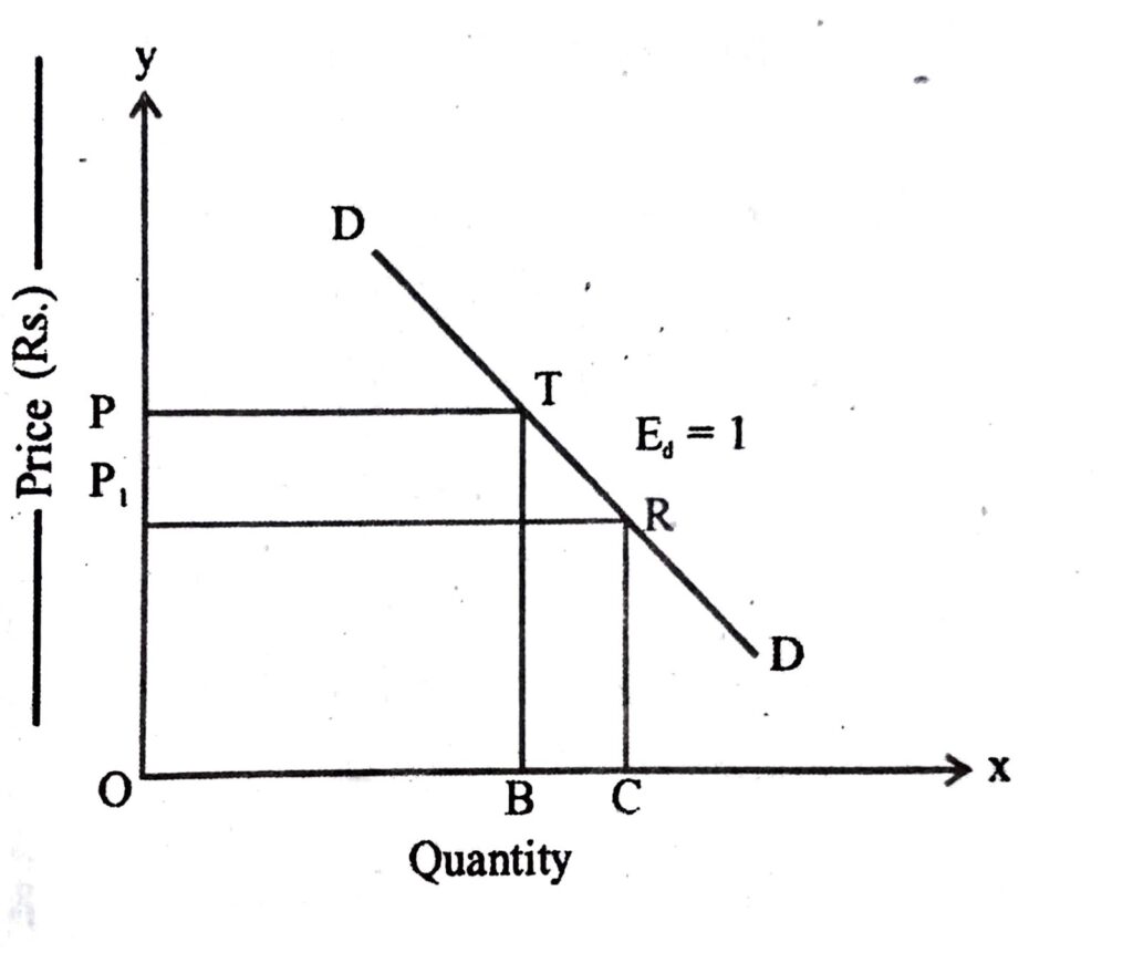 (c) Unitary Elastic Demand : It is a situation, when change in quantity demanded in response to change in price of the commodity is such that expenditure on the commodity remains constant. Total expenditure= Quantity purchased x price. In the figure, when price is OP, quantity demanded is OB and total expenditure is OB ×OP= area OBTP. Likewise, when price is P₁ total expenditure is OC x OP₁= Area OCRP₁ Area OBTP = Area OCRP₁ implying that total expenditure remains constant even after change in price of the commodity. Hence, elasticity of demand is unity.