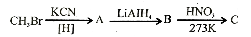 Ans: A – CH3CN, B – CH3 – CH2 – NH2, C- CH3CH2OH.