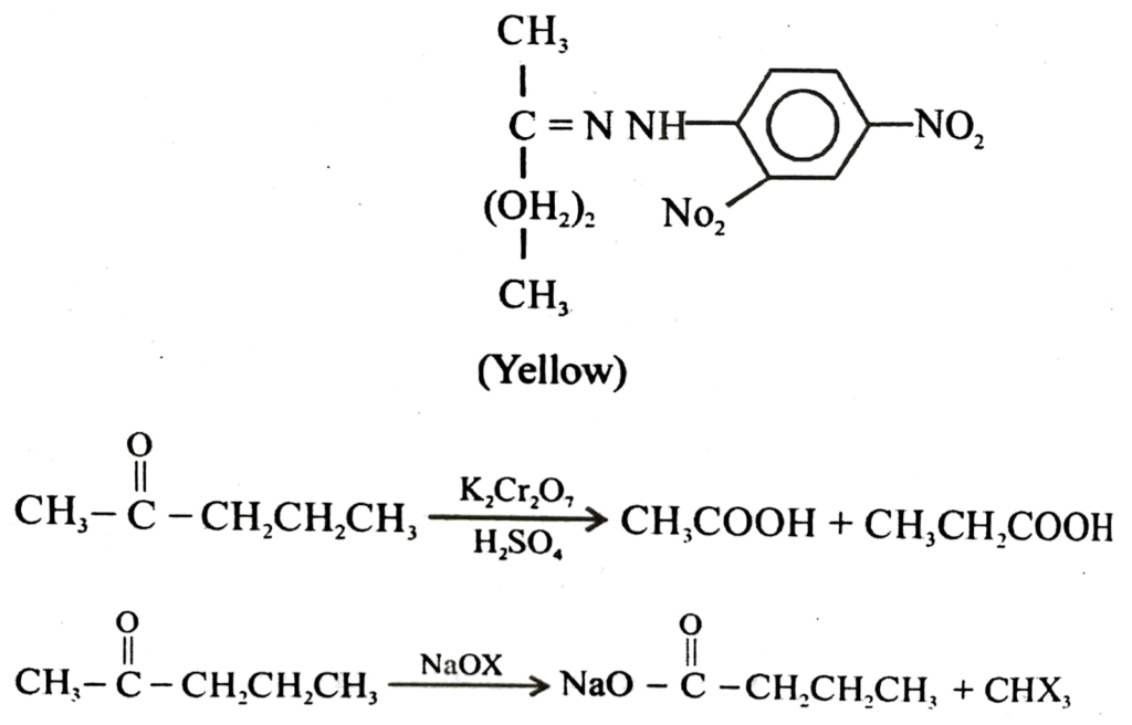 (b) An organic compound contains 69.77% carbon, 11.63% hydrogen and rest oxygen. The molecular mass of the compound is 86. It does not reduce Tollen’s reagent but forms an addition compound with sodium hydrogensulphite and give positive iodoform test. On vigorous oxidation it gives ethanoic and propanoic acid. Identify the compound and write equations for chemical reactions involved.