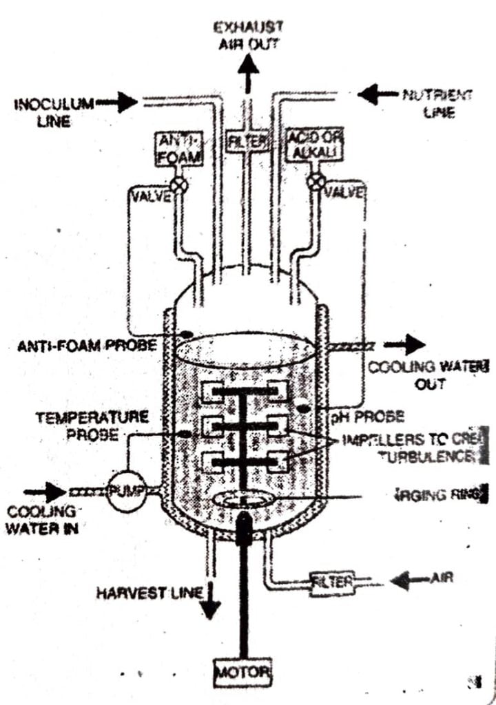 Ans : Structure: The basic design of a stirred-tank fermenter is shown below: It consists of a large stainless steel vessel with a capacity of upto 500,000 dm’ around which there is a jacket of circulatory water used to control the temperature within the fermenter. There is also an agitator, comprising of a series of flat blades, which can be rotated with the help of a motor. This ensures the thoroughly mixing of the contents so that nutrients come in close with the micro-organisms. The agitator also 7. sparged prevents settling out of the cells at the bottom.