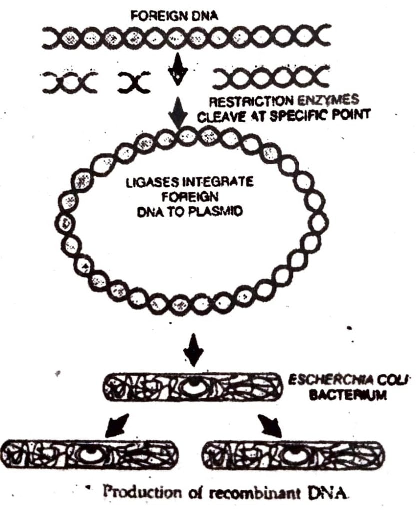 (iii) Isolation of suitable bacterial plasmid (extra circular DNA present in many bacteria that are not part of chromosome but can replicate usually and inherit certain traits) and cutting it at a place by restriction enzyme and joining the donor DNA fragment with it with the help of an enzyme called ligase. The plasmid containing parent DNA and donor DNA is called recombinant DNA.