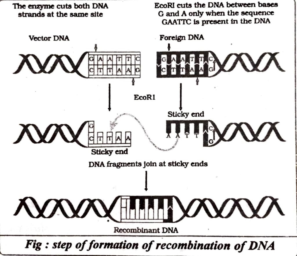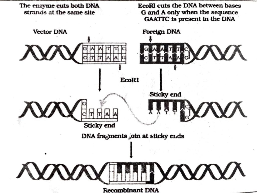 Q.1. EcoRI is used to cut a segment of foreign DNA to form a recombinant DNA. Show with the help of a diagram.