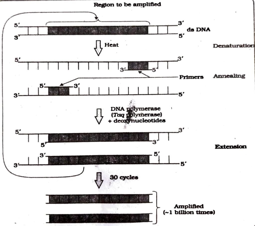 Ans : The polymerase chain reaction or PCR multiplies copies of DNA or its segments in vitro using two sets of primers which are small chemically synthesized oligonucleotides complementary to the regions of DNA and an enzyme called DNA polymerase. The enzyme polymerase extend the primers using nucleotides provided in the reaction and the DNA part provided as template. The process of replication can be repeated and a billion copies of the DNA can be multiplied. Thus a small fraction of DNA can be multiplied for study and use in genetic engineering. The following procedure is applied for obtain multiple copies of DNA.