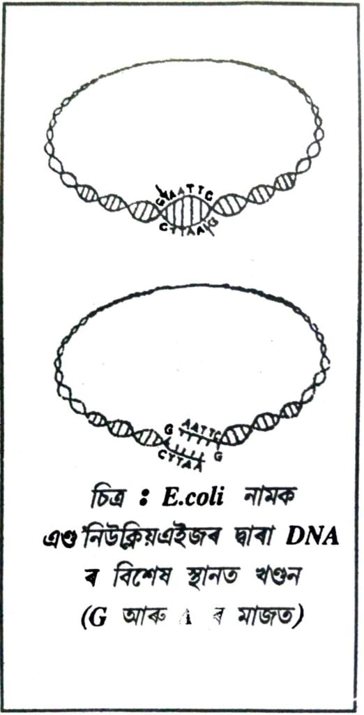 উত্তৰঃ DNA ক পুৰ্ণগঠন কৰা হয় অস্ত্ৰেপচাৰৰ যোগেদি । তাৰ বাবে প্ৰথমতে লাইছ’জাইম নামৰ উৎসেচকৰ দ্বাৰা জীৱকোষৰ বেৰ গলাই DNA উলিয়াই অনা হয় । উলিয়াই অনা DNA ৰ বিশেষ অংশ চিনাক্ত কৰি ৰেছট্ৰিকশন্ এণ্ড’নিউক্লিয়েজ নামৰ উৎসেচকৰ দ্বাৰা DNA ৰ বিশেষ অংশত এনেভাৱে কটা হয় যে জোৰা লাগিব পৰা আগ ওলাই থাকে ।