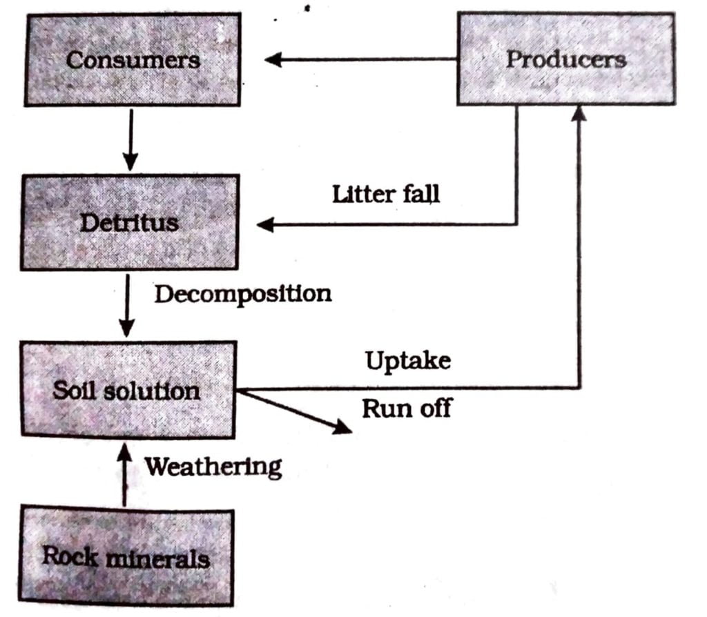 Ans : Nutrients are never lost from the ecosystems. They are recycled i.e. they circulate in the biosphere in circular path entering into the living system by converting themselves as organic compounds and then on death of the organisms the organic compounds are mineralised to return the elements into the environments. So, the movement of nutrient elements through the various components of an ecosystem is called nutrient cycling. It is also known as biogeochemical cycle.