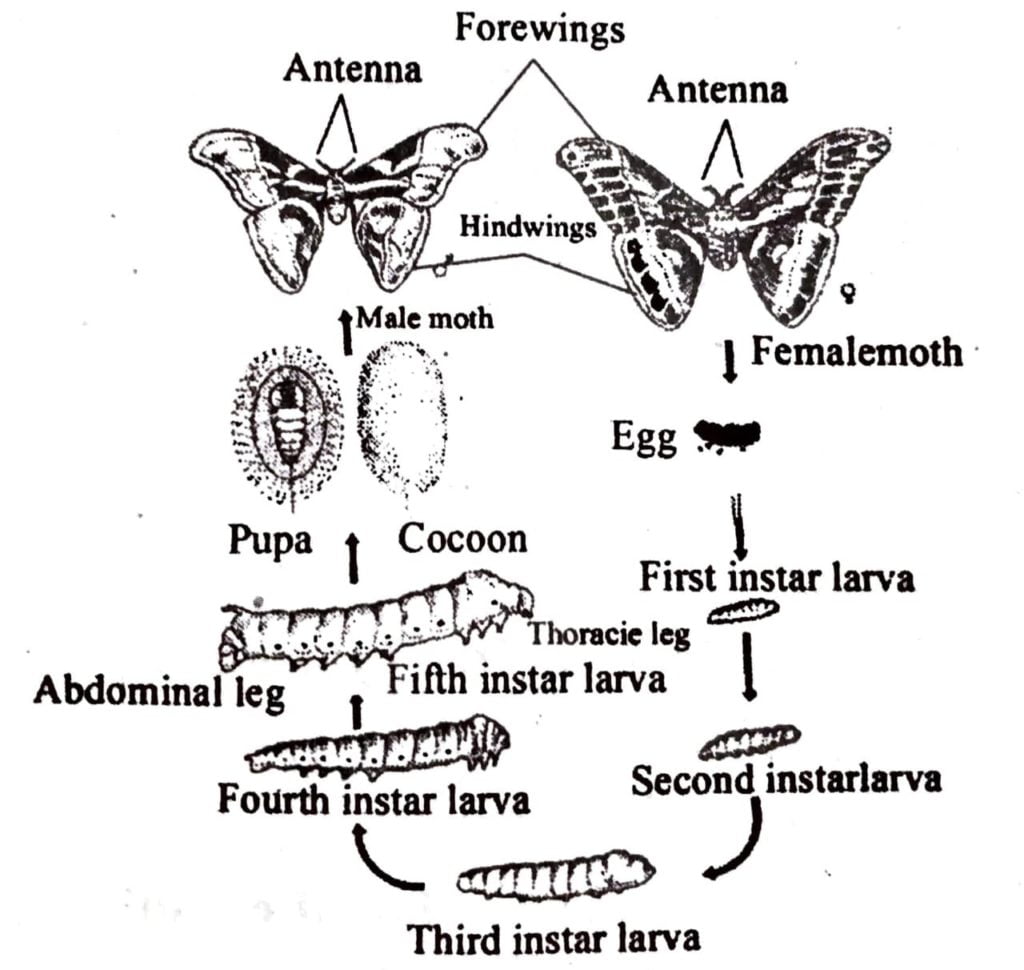 (iv) Moth : After pupal metamophosis is over, the creature emerge out by opening the cocoon within a period of 2 weeks. This stage is called moth. The body consists of 3 segments head, thorax and abdomen. The head possess a pair of antenna a pair of compound eyes and month part. The thorax possess three pairs of walking legs. The meso and meta thorax possess one pair of wing each. After emergence the adult moth starts copulation again.