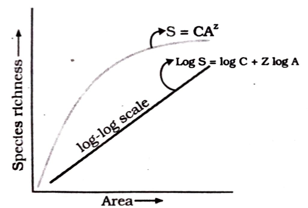 (ii) Species-area relationship : Species area relationship is a pattern of Biodiversity, the great German naturalist and Geographer Alexander yon Humboldt observed that within a region species richness increase with increasing explored area but only up to a limit. In fact, the relation between species richness and area for a wide variety of taxa out to be a rectangular hyperbola. On logarithmic scale, the relationship is a straight line described by the equation –