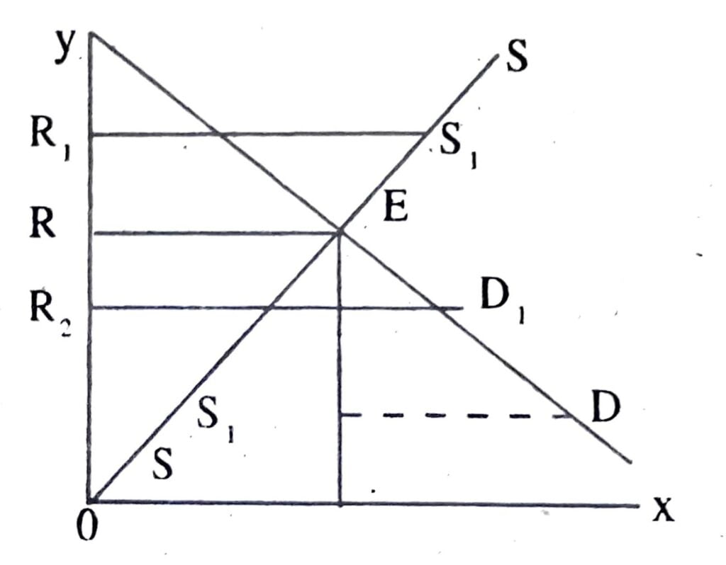 চিত্ৰত DD₁ চাহিদা ৰেখা আৰু SS₁ হৈছে। যোগান ৰেখা ডলাৰৰ কাৰণে ব্যৱহাৰ কৰা হৈছে। DD₁ আৰু R₁ SS₁ ৰেখাই E বিন্দুত কটাকটি কৰিছে তাতেই বিনিময় হাৰ নিৰ্ধাৰণ কৰা হৈছে, যেতিয়া দৰ স্তৰ বৃদ্ধি হৈছে “R₁ ” ত চাহিদা হ্রাস পাইছে। আকৌ S₁ বৃদ্ধি পাইছে ঠিক তেনেদৰে R₂ যেতিয়া হ্ৰাস পাইছে তেতিয়া SS₁ কমি গৈছে D₁ বাঢ়ি গৈছে। গতিকে DD₁ আৰু SS₁ পৰিৱৰ্ত্তন হৈছে।