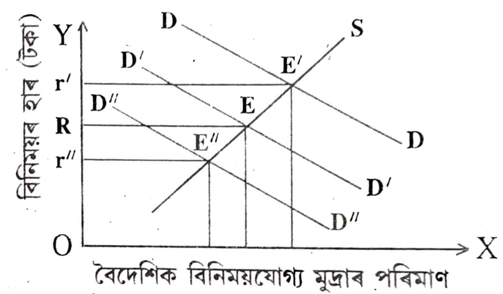 চিত্ৰত DD ৰেখাই বৈদেশিক মুদ্ৰাৰ চাহিদা আৰু SS ৰেখাই সেই মুদ্ৰাৰ যোগান বুজাইছে। DD ৰেখাডাল বাঁওফালৰ পৰা সৌপিনে ঢাল খোৱা। ইয়াৰ কাৰণ হ’ল বৈদেশিক বিনিময়যোগ্য মুদ্ৰাৰ দাম বৃদ্ধি, হ’লে বিদেশত উৎপাদিত সামগ্রী ক্রয় কৰোঁতে অধিক পৰিমাণৰ দেশীয় মুদ্রা খৰচ কৰিব লাগিব। গতিকে আমদানি কমি মুদ্ৰাৰ চাহিদাও কমি যাব। মুদ্ৰাৰ যোগান বৃদ্ধি হ’ব লাগিলে দেশৰ ভিতৰত উৎপাদিত সামগ্ৰীৰ বৈদেশিক চাহিদা স্থিতিস্থাপকতা এককতকৈ অধিক হ’ব লাগিব। ৰপ্তানিৰ জৰিয়তে অৰ্জন কৰা বৈদেশিক মুদ্ৰাৰ পৰিমাণ বৃদ্ধি হ’ব। চিত্ৰত E বিন্দুত বৈদেশিক বিনিময়যোগ্য মুদ্ৰাৰ চাহিদা আৰু যোগান সমান হৈছে। গতিকে E ভাৰসাম্য বিন্দুত Or হ’ল ভাৰসাম্য বিনিময় হাৰ। মুদ্ৰাৰ চাহিদা বৃদ্ধি হোৱাত নতুন চাহিদা ৰেখা DD হ’ল।” অপৰিৱৰ্তিত যোগানৰ বাবে DD’ যে E বিন্দুত কটাকটি কৰে। নতুন ভাৰসাম্য বিনিময় হাৰ হ’ব। সেইদৰে বৈদেশিক বিনিময়যোগ্য মুদ্ৰাৰ চাহিদা হ্রাস পালে যোগান অপৰিৱৰ্তিত অৱস্থাত নতুন ভারসাম্য বিন্দু ‘E’ হ’ব আৰু ভাৰসাম্য বিনিময় হাৰ ‘r’ হ’ব।