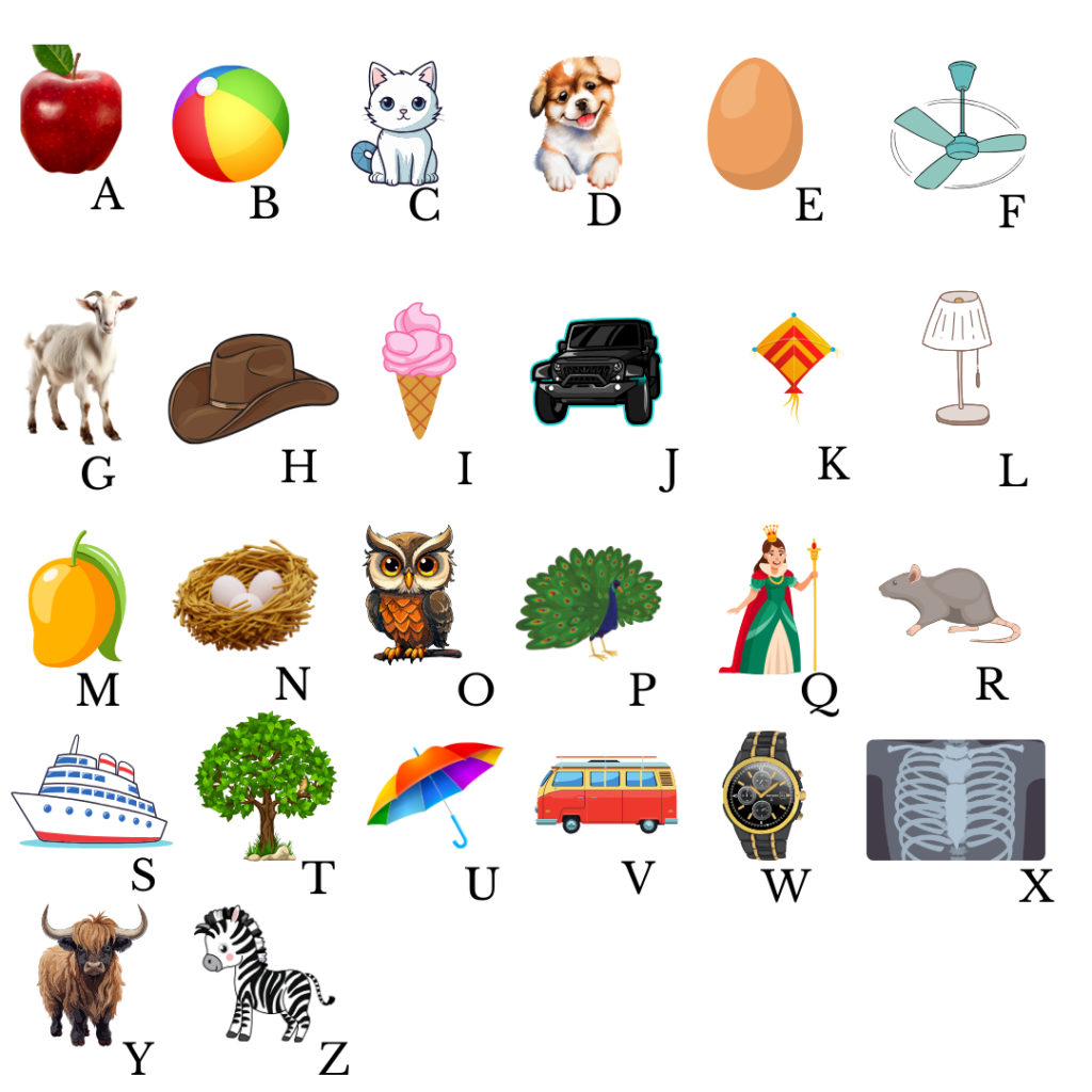 | bat | hat | ball | doll | jug | zebra | shelf |
