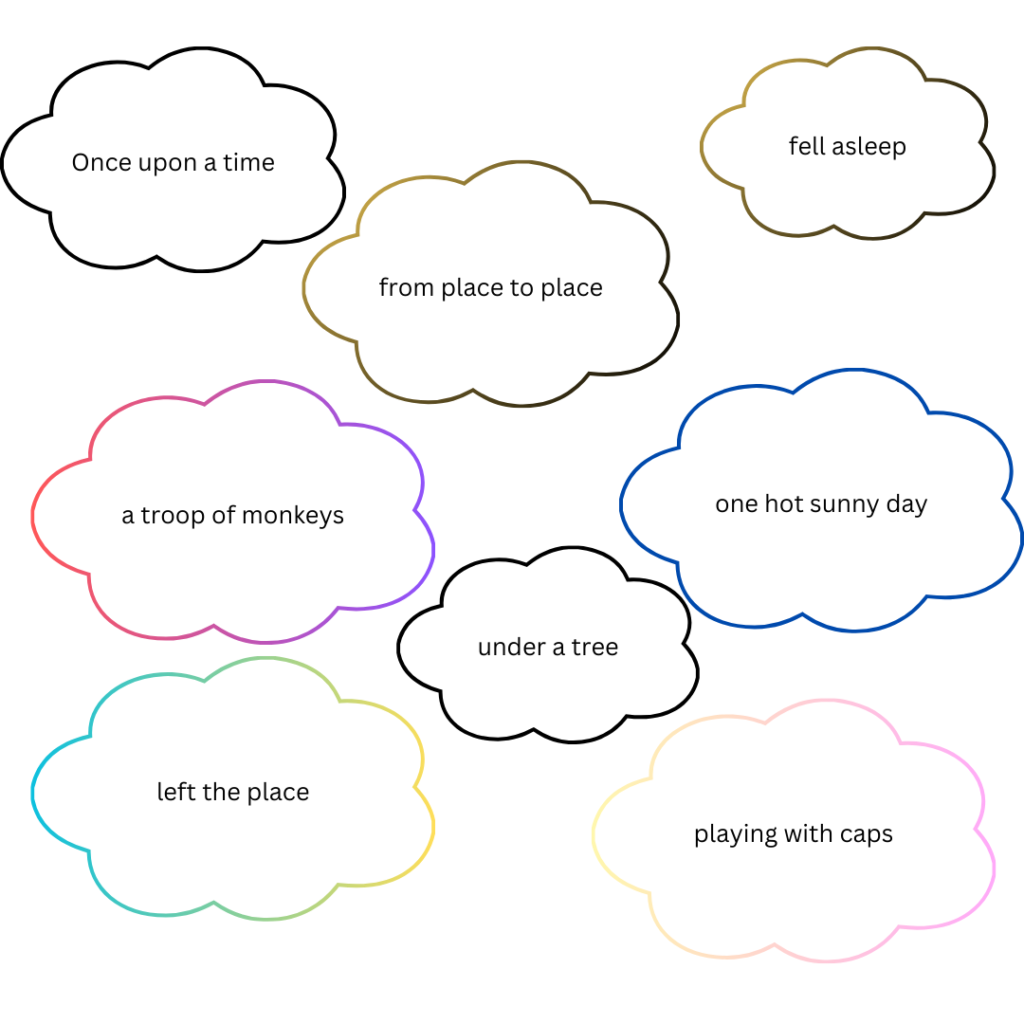 Word notes : Once upon a – এসময়ত। A cap seller- টুপী বেচোঁতা। moved- গৈছিল। from place to place- ‘ইঠাইৰ পৰা সিঠাইলৈ। Once upon a- এসময়ত। sell- বিক্ৰী কৰা। hot sunny day- গৰম দিন। under- তলত। put-ৰখা। basket- খৰাহী। near – ওচৰত। tired- ভাগৰুৱা। soon- সোনকালে। fell- পৰিছিল। asleep – টোপনি। troop of monkeys-বান্দৰৰ জাক। took away- লৈ যোৱা।