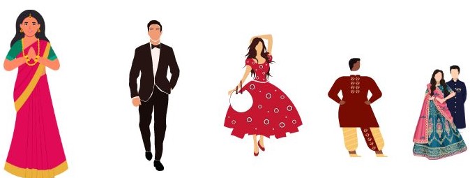 5. Work in small groups. Talk about each person and what they are wearing. Look at different dresses. Which one will you wear for a marriage party? Circle it: