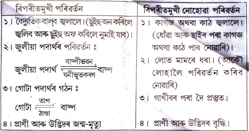 উত্তৰঃ – বিপৰীত মুখী আৰু বিপৰীত মুখী নোহোৱা পৰিৱৰ্তনৰ উদাহৰণ ―