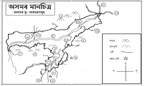 ৭। ভাৰতৰ উত্তৰ-পূব অঞ্চলৰ এখন নক্সা মানচিত্ৰ অংকন কৰি ভুচিত্ৰাৱলীৰ সহায় লৈ সিপিঠিত দিয়া অৱয়ৱসমূহ বহুওৱা।