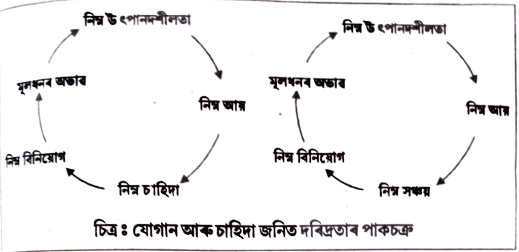 (ক) দৰিদ্ৰতাৰ পাকচক্রঃ দৰিদ্ৰতাৰ পাকচক্ৰত কেতবোৰ কাৰকে চক্ৰাকাৰে ইটোয়ে আনটোৰ লগত জড়িতহৈ থাকে উদাহৰণস্বৰূপে, অনুন্নত অৰ্থনীতিৰ দৰিদ্ৰতাৰ পাকচক্ৰটো মূলধন অভাৱ, বজাৰৰ অপূৰ্ণতা আৰু পিছপৰা অৰ্থনীতিৰ পৰা ঘাইকৈ শিপায়। কিন্তু দৰিদ্ৰতাৰ পাকচক্ৰটো চাহিদা আৰু যোগান দুয়োটা দিশৰ পৰা সুচল।