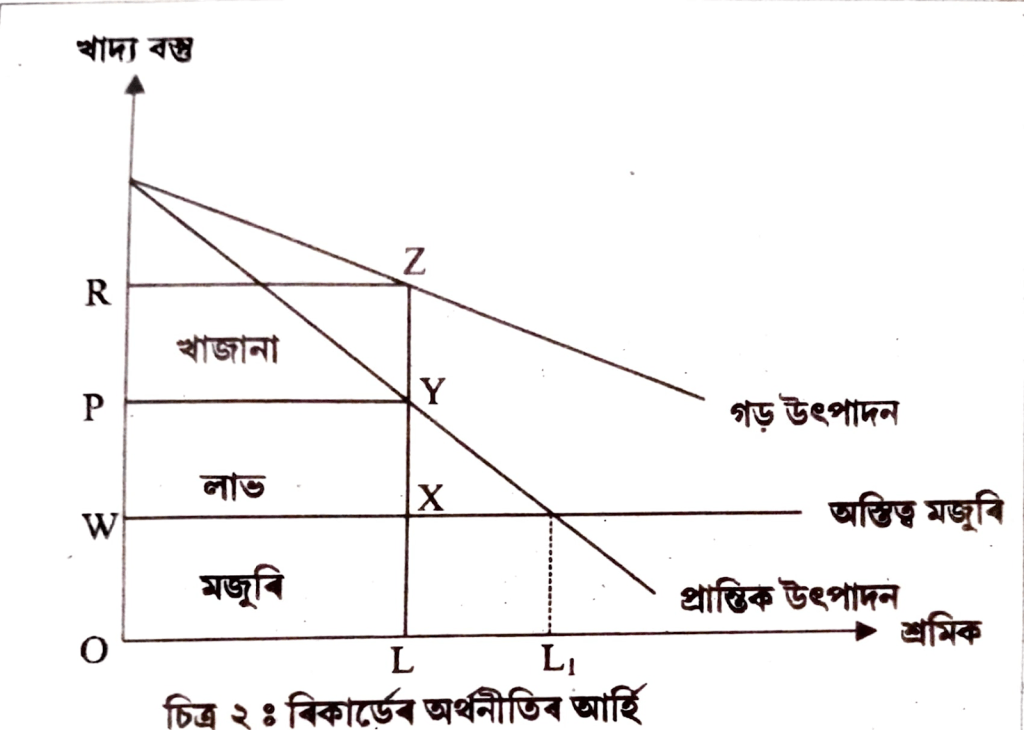 খাজনা আৰু মজুৰিৰ মাজত পাৰ্থক্য WPYX। মুঠ উৎপাদন বঢ়াৰ লগে লগে শ্ৰমিকৰ প্ৰান্তিক উৎপাদন অস্তিত্ব মজুৰিলৈ (L) হ্ৰাস পাব আৰু লাভ পৰিমাণ নোহোৱা হ’ব। ভাৰসাম্য অৱস্থাত কৃষি আৰু উদ্যোগ খণ্ডৰ লাভ সমান হ’ব। যেতিয়া কৃষিখণ্ডৰ লাভ কমিব তেতিয়াই মূলধন উদ্যোগ খণ্ডলৈ স্থানান্তৰ হ’ব। এনে ক্ষেত্ৰতো বৰ্ধিত মজুৰিৰ বাবে লাভৰ পৰিমাণ আগ্রাসন হ’ব।