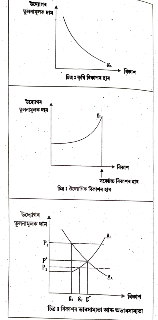 কৃষিখণ্ডৰ বিকাশ হ’ল ইয়াত হোৱা বিনিয়োগ আৰু বিনিয়োগৰ উৎপাদনশীলতাৰ ফলন। কিমানখিনি বিনিয়োগ কৰিব সেয়া নিৰ্ভৰ কৰিব উদ্যোগ খণ্ডৰ লগত থকা তুলনামূলক দামৰ ওপৰত। গতিকে কৃষিৰ বিকাশৰ হাৰ (gA) আৰু উদ্যোগখণ্ডৰ তুলনামূলক দামৰ সম্পৰ্ক ওলোটা।