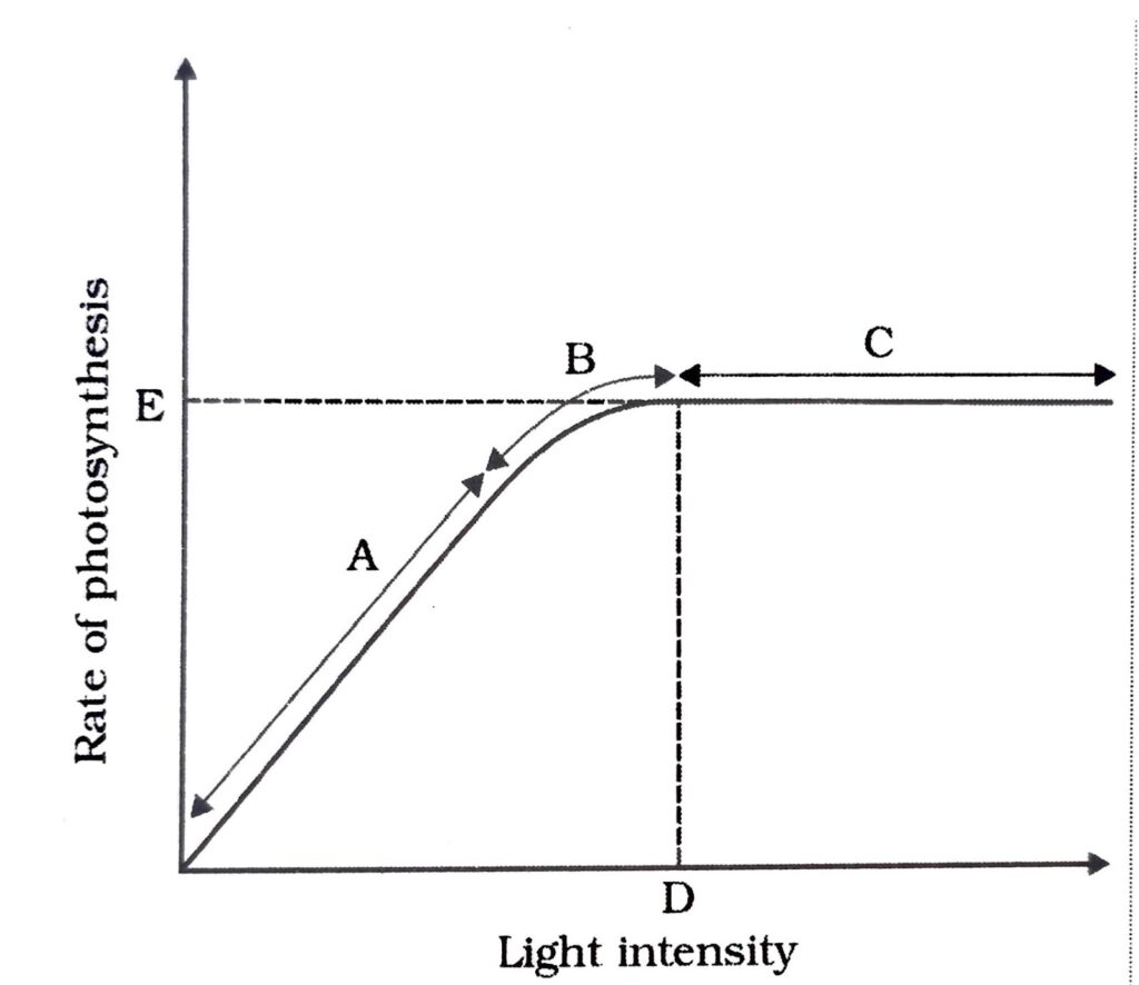 (c) C is the region where rate of photosynthesis does not increase with the increase in light intensity. Point D represents the optimum point and rate of photosynthesis remains constant after this point.