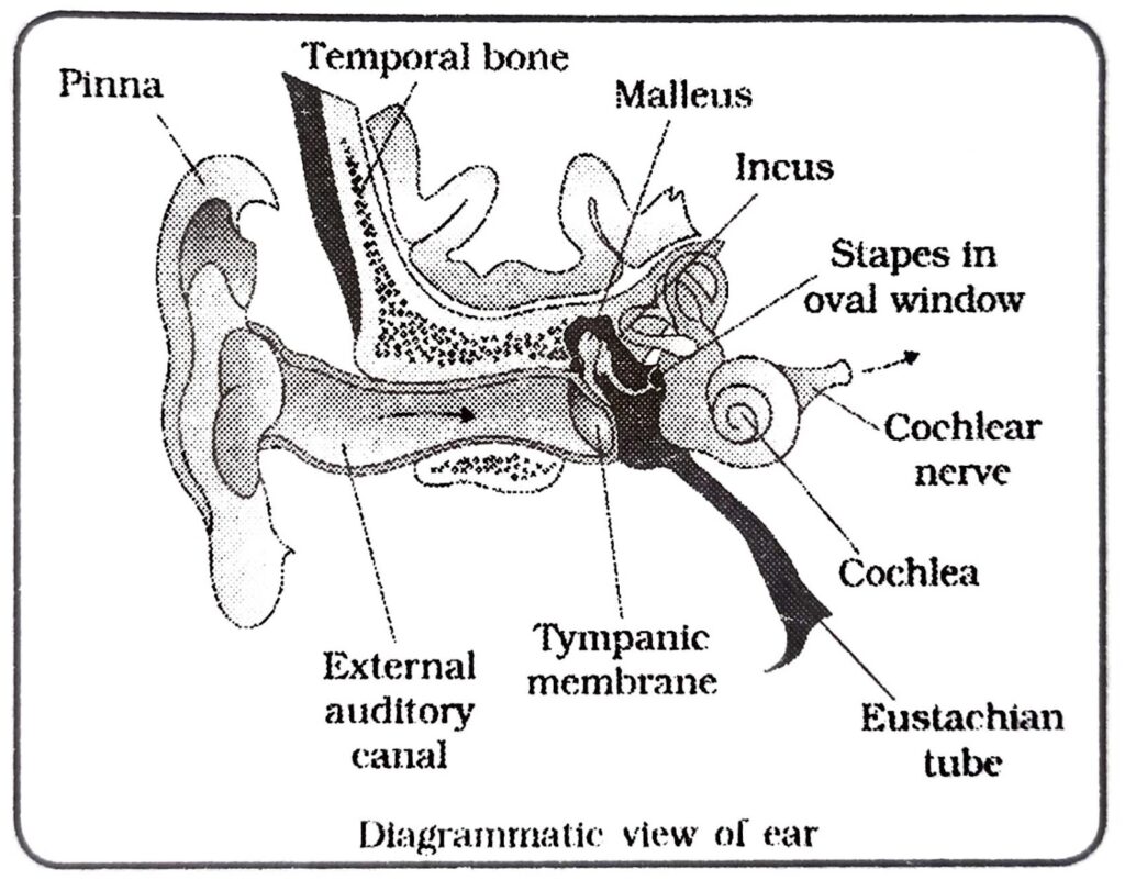 (ii) Ear consists of three major sections: external ear, the middle ear and the internal ear.