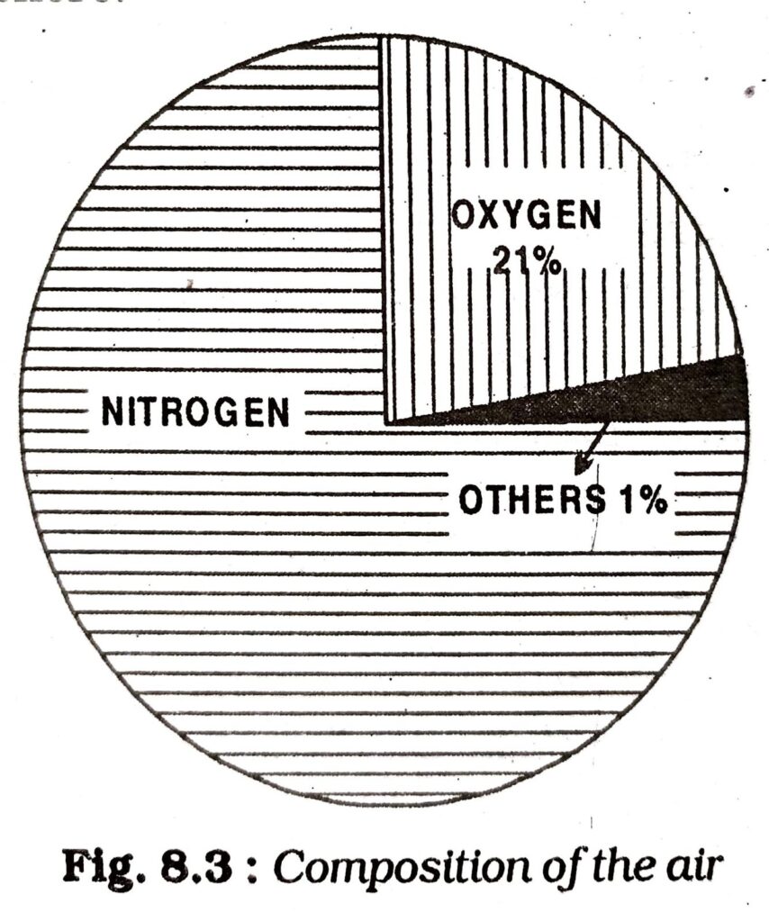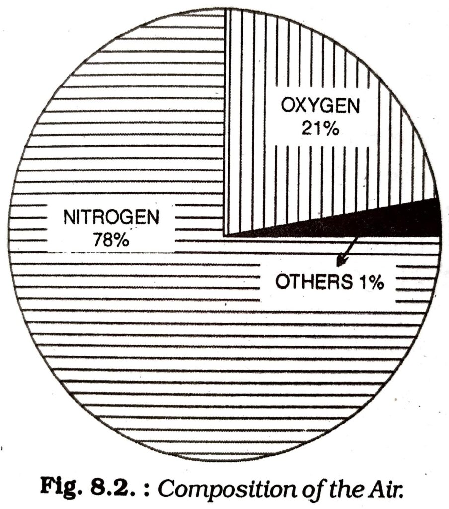 1. Gases: Nitrogen (78%), Oxygen (21%) are the two major gases. The remaining 1% is composed of a number of gases like hydrogen argon, ozone, helium, carbon dioxide, etc. oxygen is the most vital gas for sustaining life.
