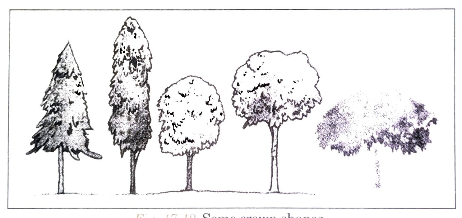 Q. 1. Draw a diagram of different types of crowns of different trees.