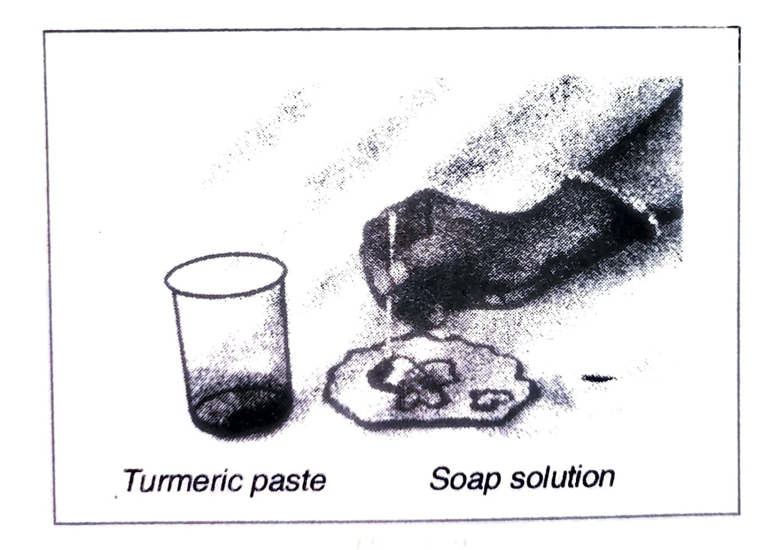 Q. 12. Why does a turmeric stain on white shirt is turned to red when it is washed with soap?