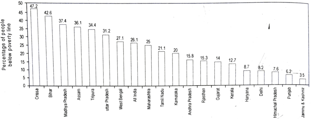 Ans. Interstate disparities in India: One of the aspects of poverty in India is inter-state disparities in India. The proportion of poor people is not the same in every state. Although state level poverty has witness a regular declined from the levels of early seventies, the success rate of reducing poverty varies from state to state. Inter-state disparities of poverty in India is clear from the following facts: