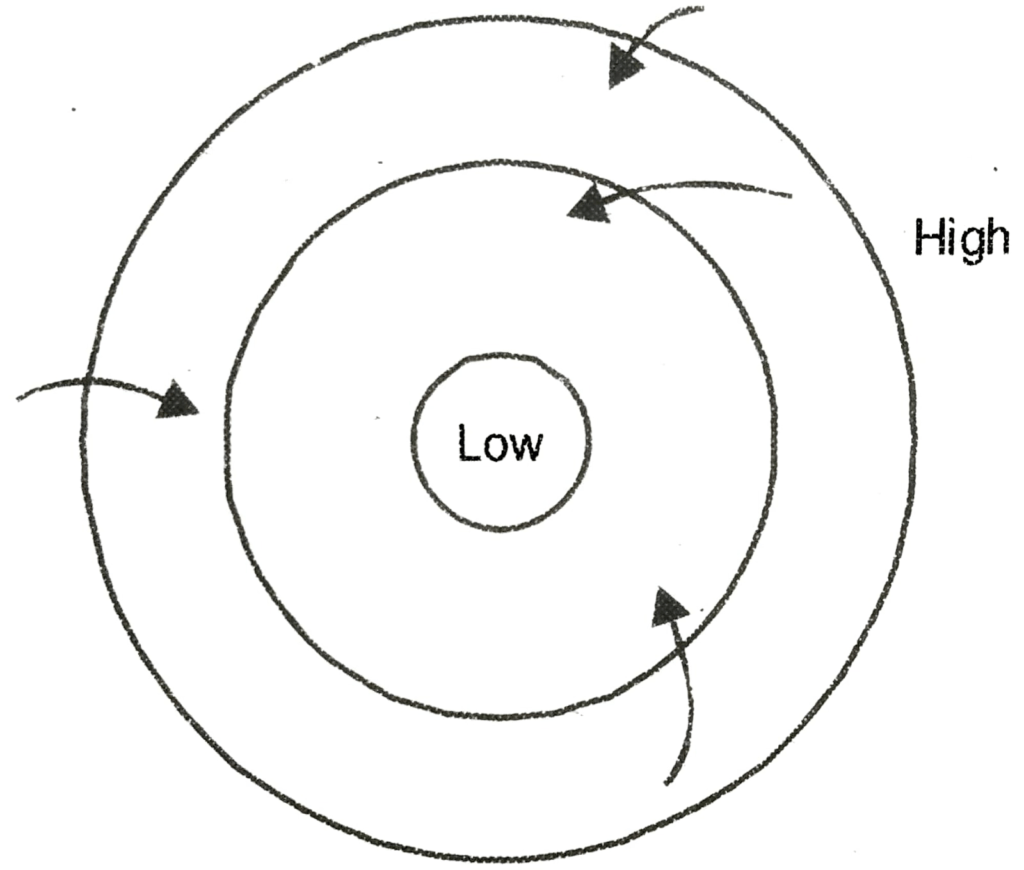 Q. 3. A cyclone is a low pressure area usually formed in a disturbing zone of warm and cold air masses. Study the figure and answer the questions below.