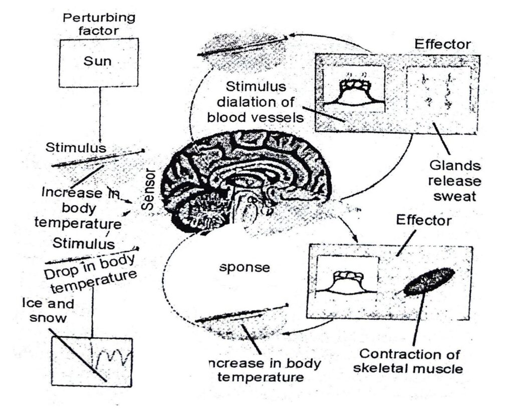 Norm (a set point) → A sensor → An integrating centre → Effectors.