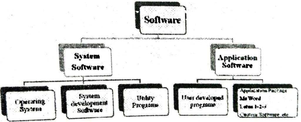 Ans. Software: Computer cannot do anything on its own. It is the user who instructs computer; what to do, how to do and when to do. In order to perform any task, we have to give a set of instructions in a particular sequence to the computer. These sets of instructions are called programs. Software refers to a set of programs that makes the hardware perform a particular set of task in particular order. Software can be classified mainly into following categories and sub-categories are shown in figure below: