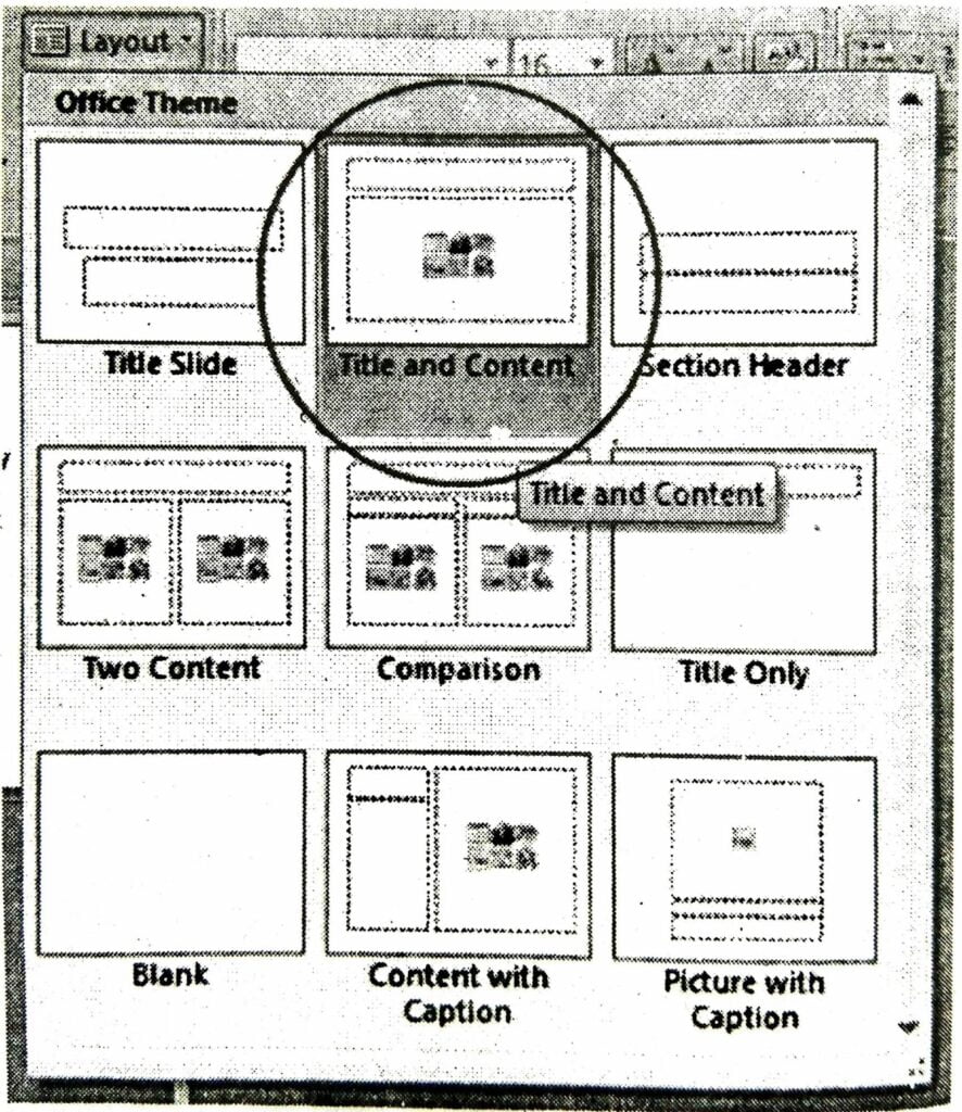 Ans. Changing Slide Layouts: To change the layout template of the slide select Home → Layout command on the menu bar. The Slide Layout dialog box appears with nine layouts. Click on one of the layout thumbnail images to apply.