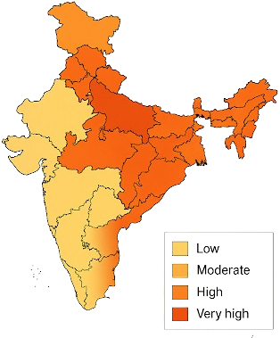(iii) High (उच्च भेद्यता): नारंगी रंग में उत्तर प्रदेश, ओडिशा, बिहार, झारखंड, केरल, पश्चिम बंगाल आदि राज्यों के कई हिस्से आते हैं, जो आपदा के लिहाज से अधिक संवेदनशील हैं।
