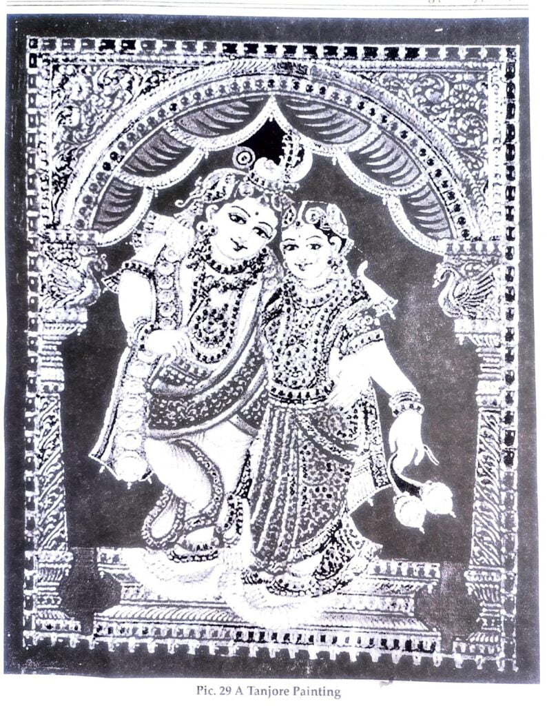 Ans: This art originated in Thanjavur (Tanjore) in Tamil Nadu during 16th C.AD., but most of the extant works belong to 19th C.A.D. This style became very popular in the surrounding regions, and spread all over the Deccan. The popular theme had been Krishna, Radha, Vishnu and Ganesha.