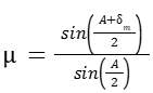 Step 1: Use the formula for refractive index with minimum deviation: