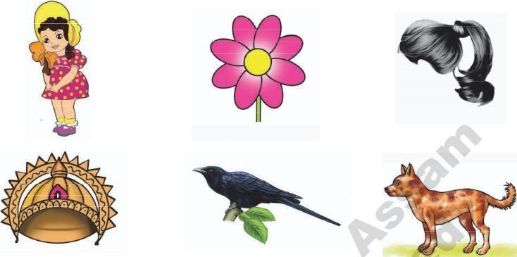 উত্তৰঃ পুতলা, ফুল, চুলি, মুকুট, কাউৰী, কুকুৰ।