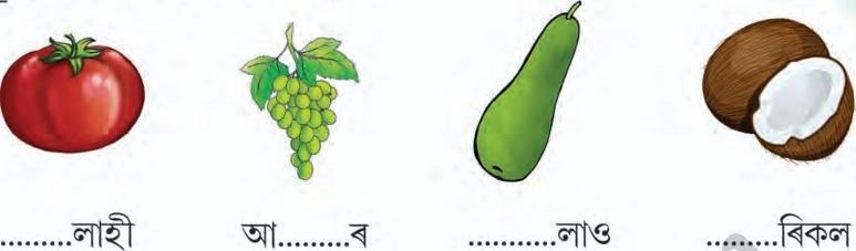 ১। ‘ফল’, ‘গাত’, ‘ধৰে’, ‘পকা’ – এই শব্দকেইটাৰ শেষৰ ধ্বনিৰ মিল থকা নতুন শব্দ গঠন কৰি খালি ঠাইত লিখোঁ আৰু পঢ়োঁ আহা-